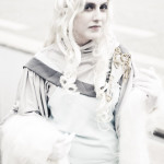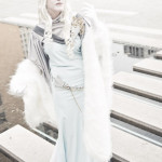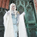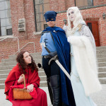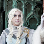 I quite like the designs for Lumi, and while flipping through one day I realized I pretty much had all the fabric for this one. Plus Mici (Who is Red Riding Hood here) had done Lumi before so already had the perfect wig, and a stole I could borrow. The blue is leftover lining from my Hotohori coat/cloak/thing, the grey dress was left over from Voldemort’s sash (obviously, I way over bought for that), the grey sheer in the back fluffy bit was left over from my Vilya costume because I hadn’t realized I’d bought grey until I had it against the whites, and the grey collar piece was from a Subaru costume I think. The shoulder thingy is craftfoam and trim, the belt was a terrible monstrosity I found at the thrift store painted up and modified (and never would sit right, augh), and the earring I just plum forgot about. My makeup was done by my lovely twin Miss Molly.