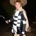 The leggings I’d made for something else which I never actually finished, the hat was a straw hat I picked up at Michaels that I covered, and the shirt, pin, and cape I made from scratch. The cape is my favourite because I spent a movie just cutting little circles out to get the right shape, and then burning the edges. Any costume I can use fire in, is a good costume.